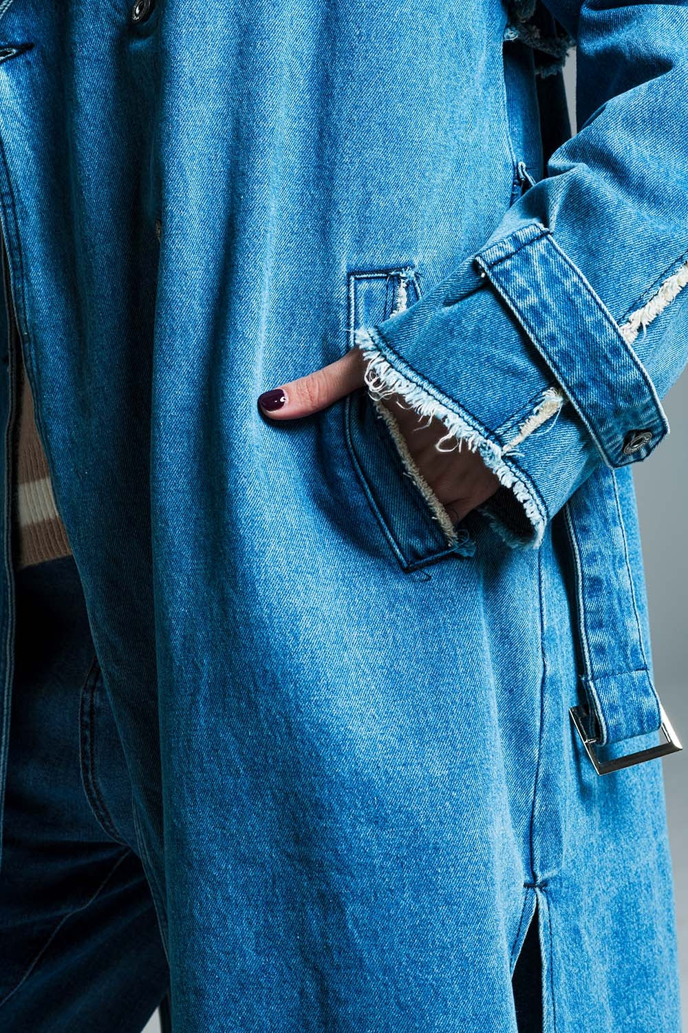 Demin Trench Coat With Belt and Raw Edges in Mid Wash