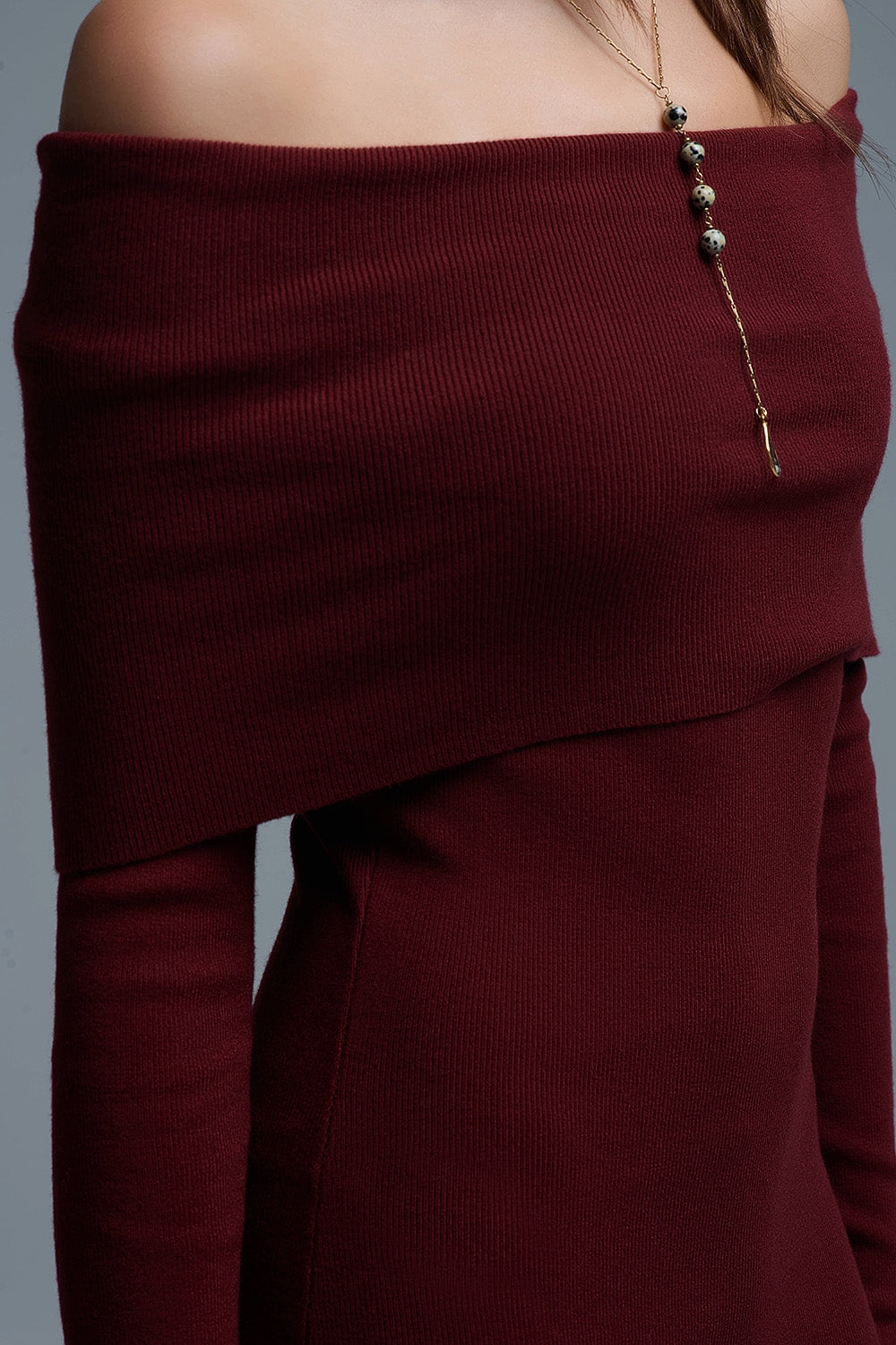 Maxi Knitted Wide Bardot Dress in Burgundy
