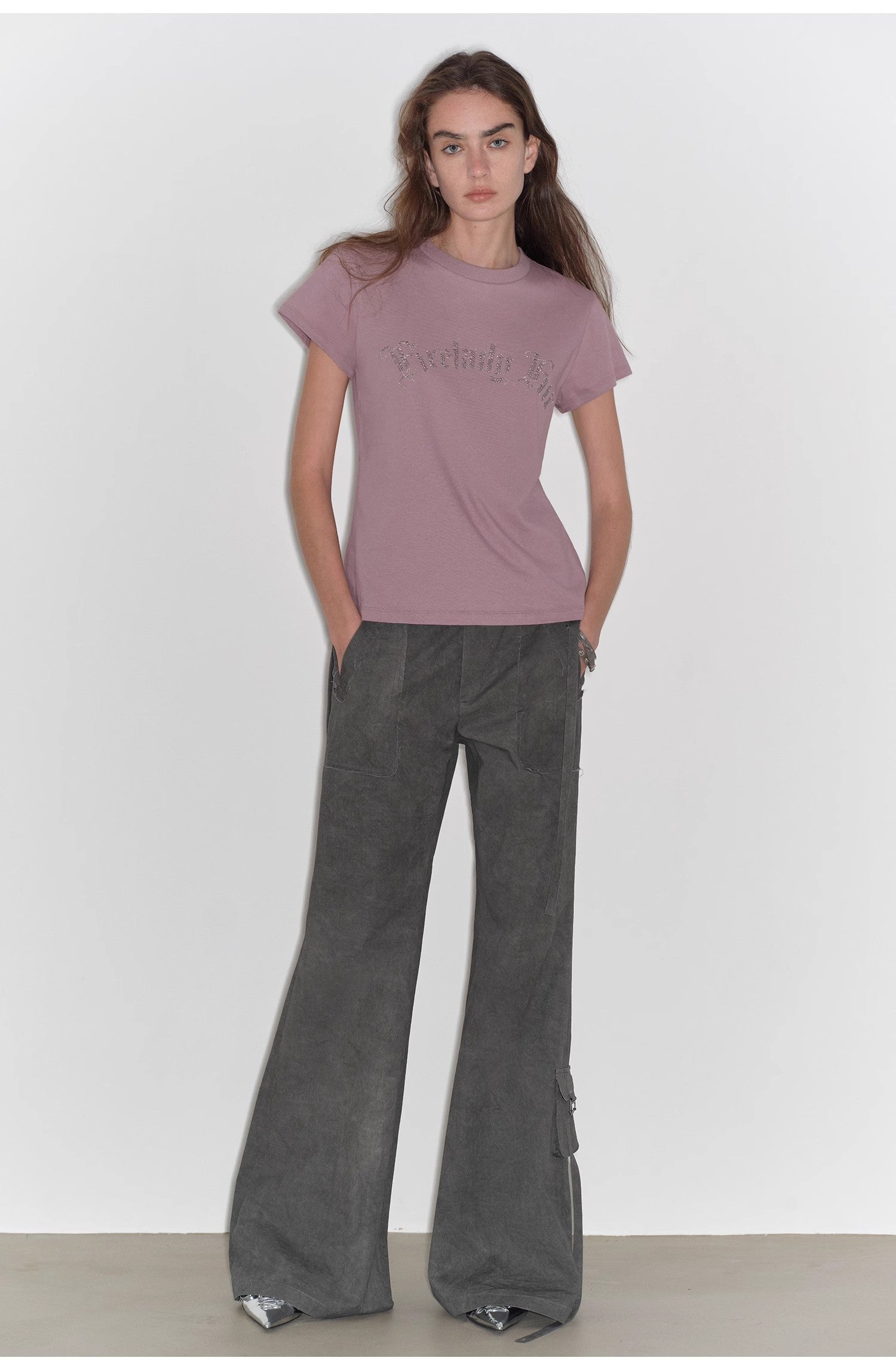 Customized translucent diamond rivets are beautifully integrated into the fabric color, and the personalized letter arrangement and combination form a rich layered effect, making the ready-made clothes fashionable.