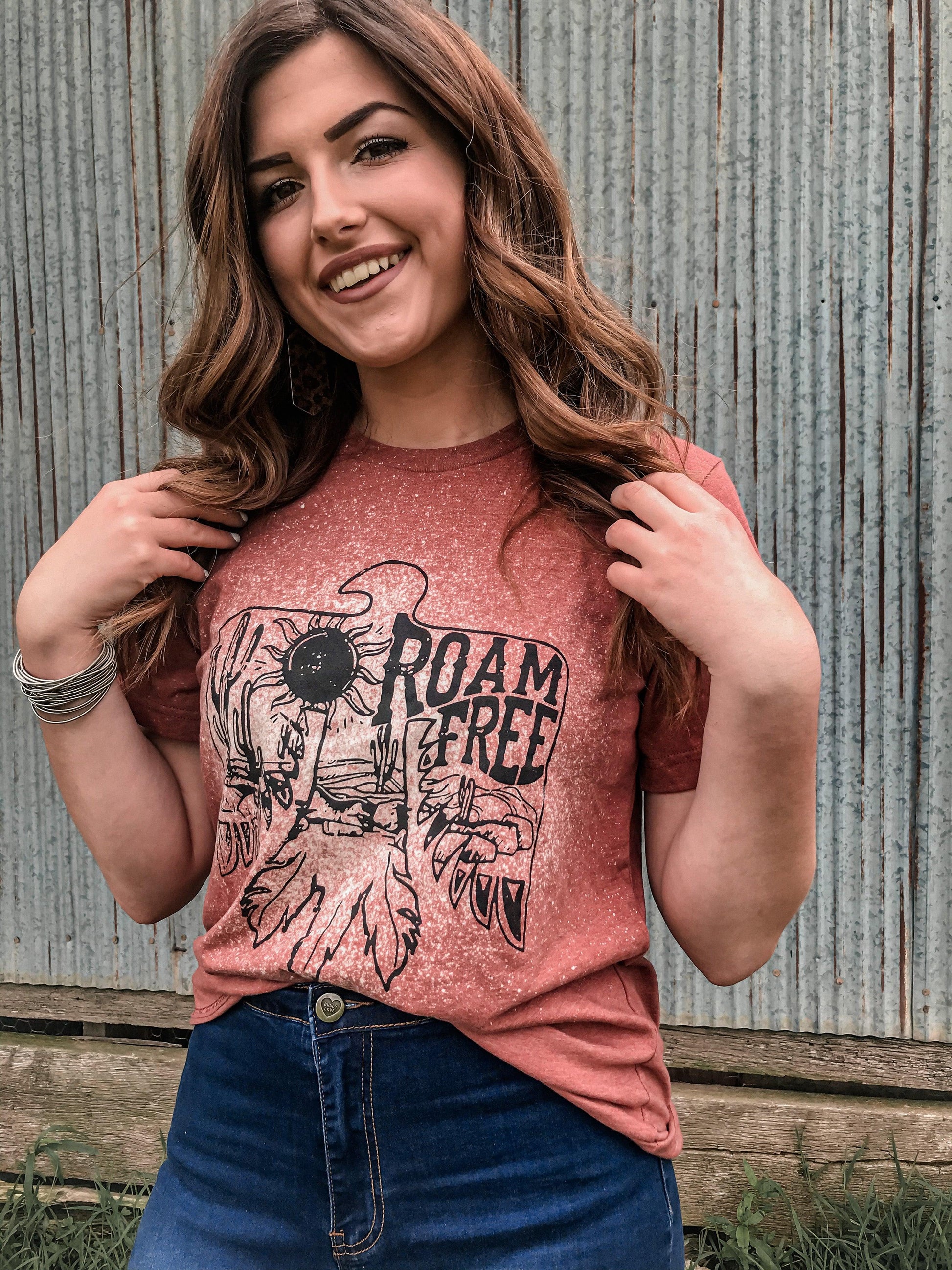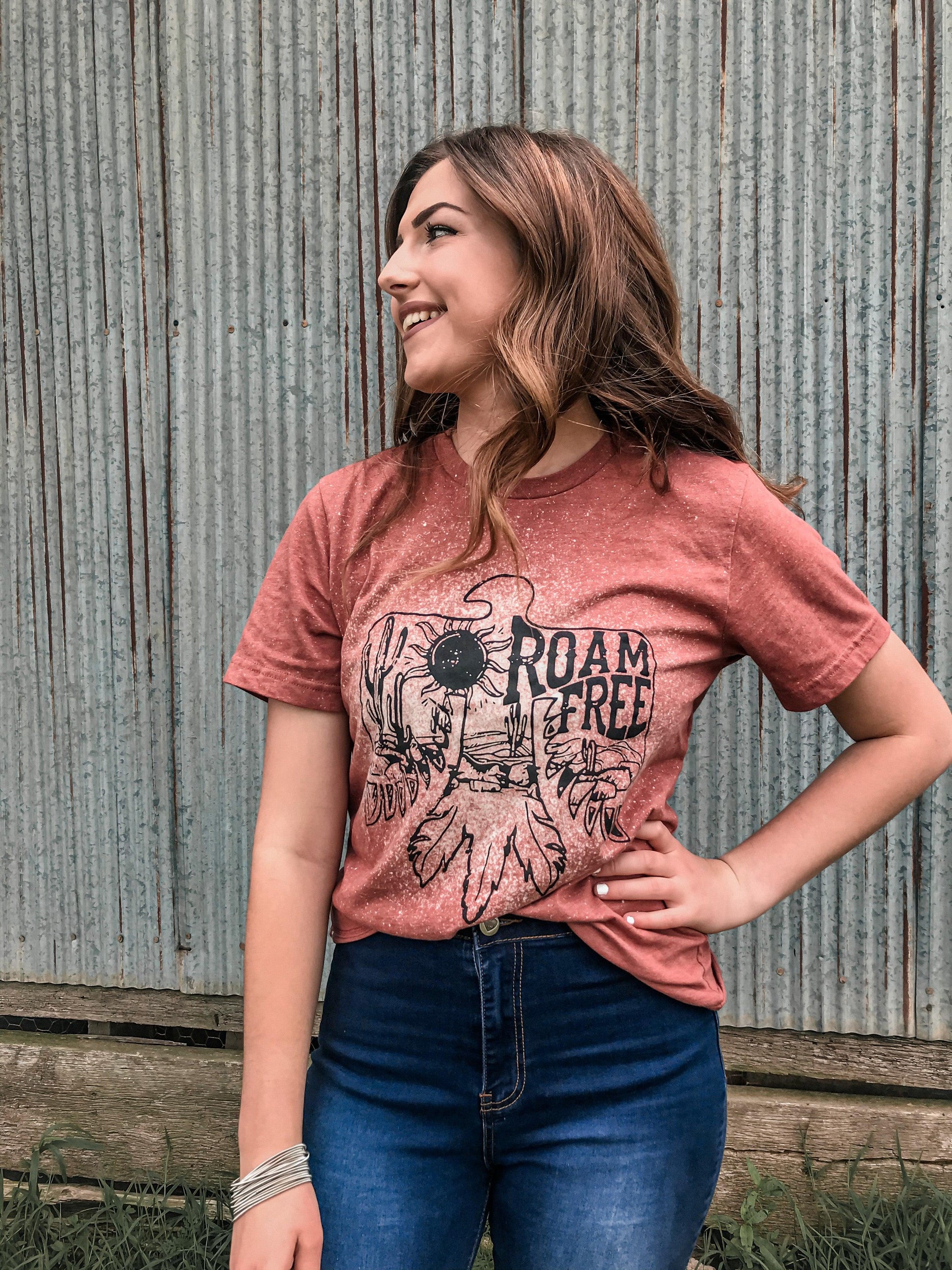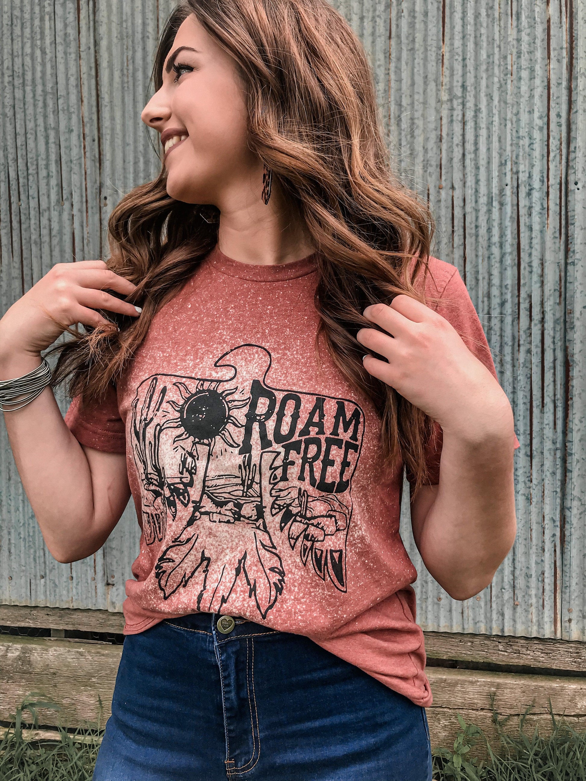 Go forth wild child and ROAM FREE!! We love the style of this distressed design and the hand bleaching make each one super special!!