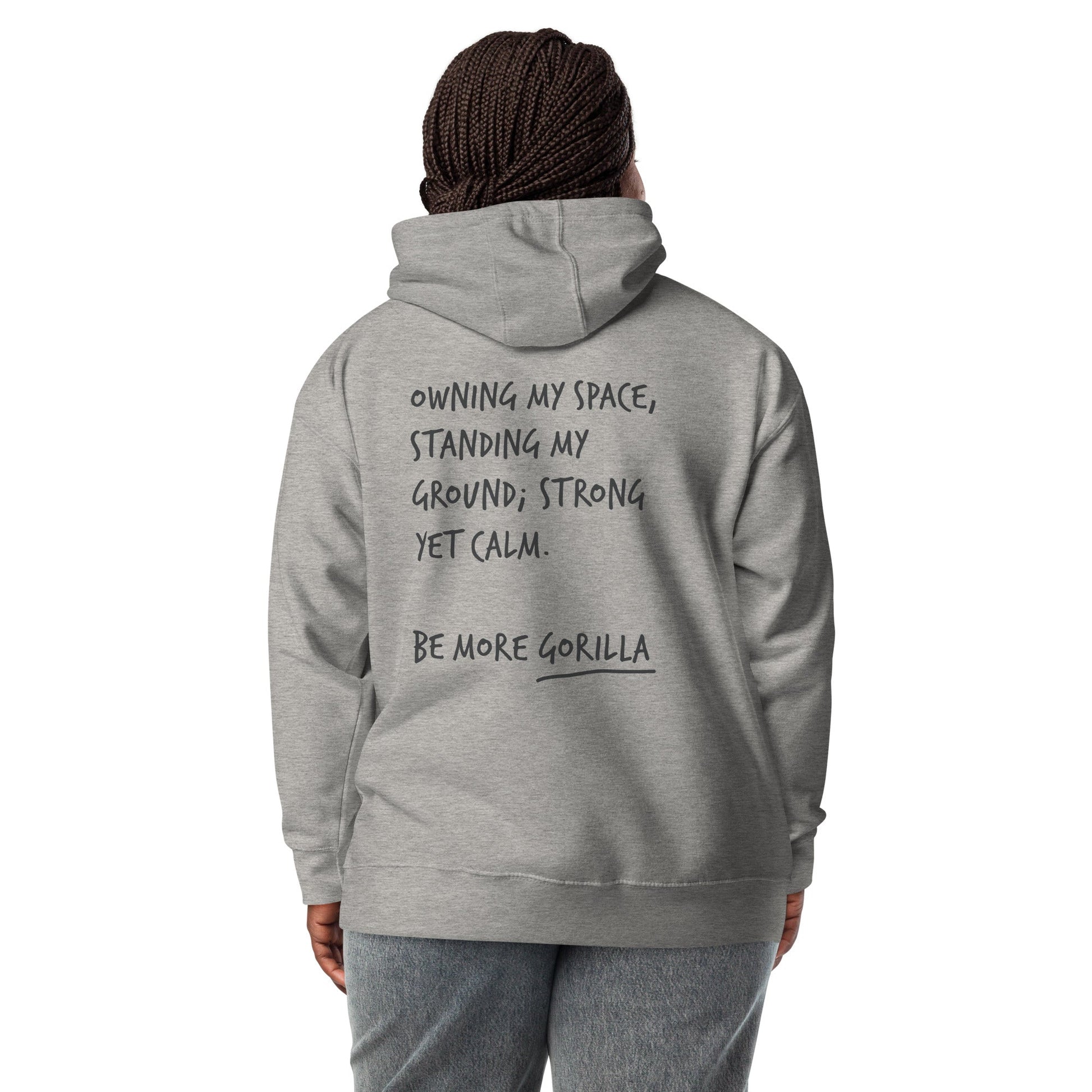 - Coloured 'Owning my space, standing my ground; strong yet calm. Be more gorilla' large font aspirations motif on back with matching embroidered gorilla and collaboration inside label. May the gorilla go forth and inspire...